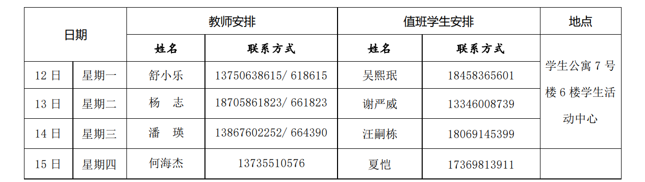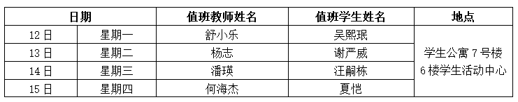 备注:1.为深入实施“大思政”理念下学院“三全育人”体系的构建和实践,推进“思政工作进公寓、学业指导在公寓”工作,本学期继续开展“教师进公寓工程”,即每周一至周四晚(19:00——21:00)安排一名教师进公寓,节假日不安排,教师可结合自己联系寝室、授课学生,通过个别谈心谈话、集体交流座谈等形式加强对学生的生活指导、学习指导、职业生涯指导、就业创业指导、心理健康指导等,满足学生成长需求。2.“教师进公寓工程”由学院学工线牵头,教师安排之日如临时有事,请做好与学工线联络工作或和其他老师调换下公寓时间安排。3.教师公寓联络人李鑫老师,组织做好值班、填写发布每周安排表、联系下公寓教师,并做好相关记录、拍照等。教师交流结束后,请自行做好相关表格登记(值班学生做好提醒)。