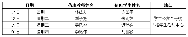备注:1.为深入实施“大思政”理念下学院“三全育人”体系的构建和实践,推进“思政工作进公寓、学业指导在公寓”工作,本学期继续开展“教师进公寓工程”,即每周一至周四晚(19:00——21:00)安排一名教师进公寓,节假日不安排,教师可结合自己联系寝室、授课学生,通过个别谈心谈话、集体交流座谈等形式加强对学生的生活指导、学习指导、职业生涯指导、就业创业指导、心理健康指导等,满足学生成长需求。2.“教师进公寓工程”由学院学工线牵头,教师安排之日如临时有事,请做好与学工线联络工作或和其他老师调换下公寓时间安排。3.教师公寓联络人李鑫老师,组织做好值班、填写发布每周安排表、联系下公寓教师,并做好相关记录、拍照等。教师交流结束后,请自行做好相关表格登记(值班学生做好提醒)。