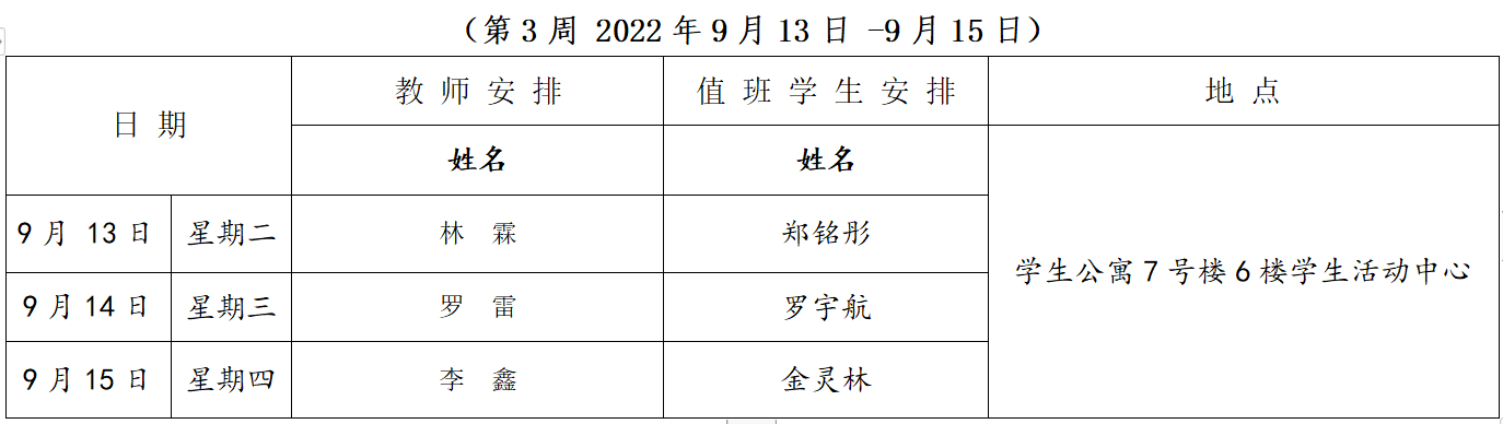 备注:1.为深入实施“大思政”理念下学院“三全育人”体系的构建和实践,推进“思政工作进公寓、学业指导在公寓”工作,本学期继续开展“教师进公寓工程”,即每周一至周四晚(19:00——21:00)安排一名教师进公寓,节假日不安排,教师可结合自己联系寝室、授课学生,通过个别谈心谈话、集体交流座谈等形式加强对学生的生活指导、学习指导、职业生涯指导、就业创业指导、心理健康指导等,满足学生成长需求。2.“教师进公寓工程”由学院学工线牵头,教师安排之日如临时有事,请做好与学工线联络工作或和其他老师调换下公寓时间安排。3.教师公寓联络人李鑫老师,组织做好值班、填写发布每周安排表、联系下公寓教师,并做好相关记录、拍照等。教师交流结束后,请自行做好相关表格登记(值班学生做好提醒)。