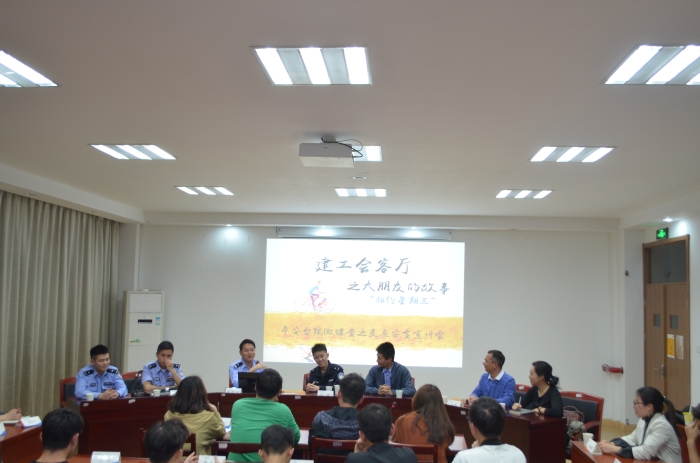 4月25日晚,台州市公共安全教育馆馆长王熙、公安局交通警察局邱伟星、童泽同等四位警官应邀做客“建工会客厅”,与建工学院学生进行安全知识主题交流。校保卫处副处长马斌、学院党总支副书记郑晓莉出席交流活动。