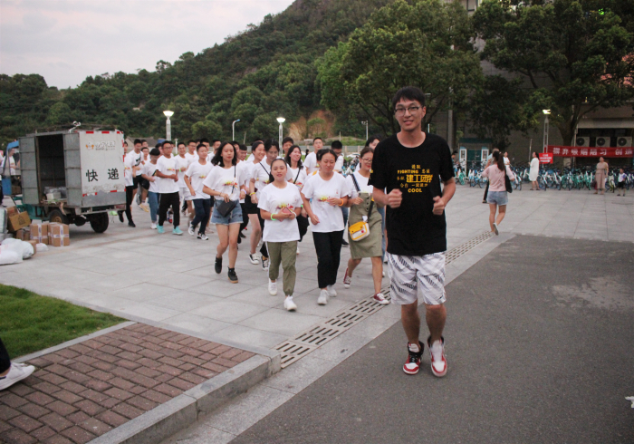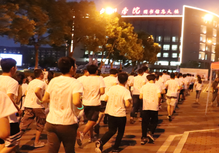 夜晚的台院星光点点,微风吹拂。285名新生身着彩虹T恤在团学干部的领跑下开始第一次校园荧光跑。手里的荧光棒在夜空中挥舞,一个个光影前后连缀,划出一道道美丽的弧线。夜跑队伍打卡教学楼、图书馆、水街、体育馆、操场,延着“阳光长跑”路线,伴着树叶沙沙声与加油口号声,整齐的队列流动成独特的风景线。到达终点合影留念后,同学们席地而坐,天南海北地畅谈,不时传来欢声笑语,夜晚的校园一派盎然生机。大家纷纷表示,“荧光跑”不仅帮助同学们熟悉了校园路线,增进了同学之间的友谊、感情,还能锻炼身体、增强体质,更让大家充分感受到了“无体育,不建工”的独特学院文化。