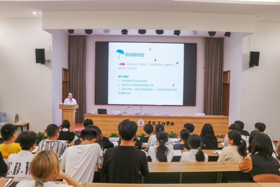 培训会上,蒋静老师从身份认知问题切入,点明新闻宣传工作是树立学院形象、展示师生风采的重要窗口,宣传工作者充当着记录者和门面担当的角色。针对新闻稿件撰写,蒋静结合自身工作经验,阐述了校园新闻稿的特点、六要素“5W+1H”以及常见的新闻稿类型,并以具体案例分析的方式,讲解了撰写新闻报道的常用结构、写作技巧、注意事项,重点强调新闻内容要真实具体,语言要平实准确,做到主题明晰、有的放矢,要求大家勤于记录、善于构思、疾于运笔,不断增强自身的听力、眼力、脑力和笔力。