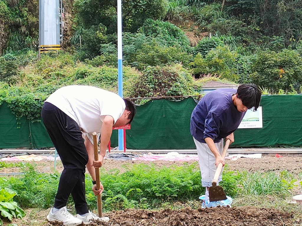 垦荒行动开始前,学生干部组织大家开展集中培训,就大陈岛垦荒精神的背景和意义进行阐述,就包括除草、播种等具体劳作过程中需要注意的事项进行讲解和说明。正式开始后,全体成员按照前期的要求完成组队,以小组的形式分工协作,共同开展清除杂草、翻土平土、播种等行动,垦荒田里热闹非凡、一派忙碌景象,各位同学在劳作中体会先辈们在大陈岛垦荒时的艰辛。
