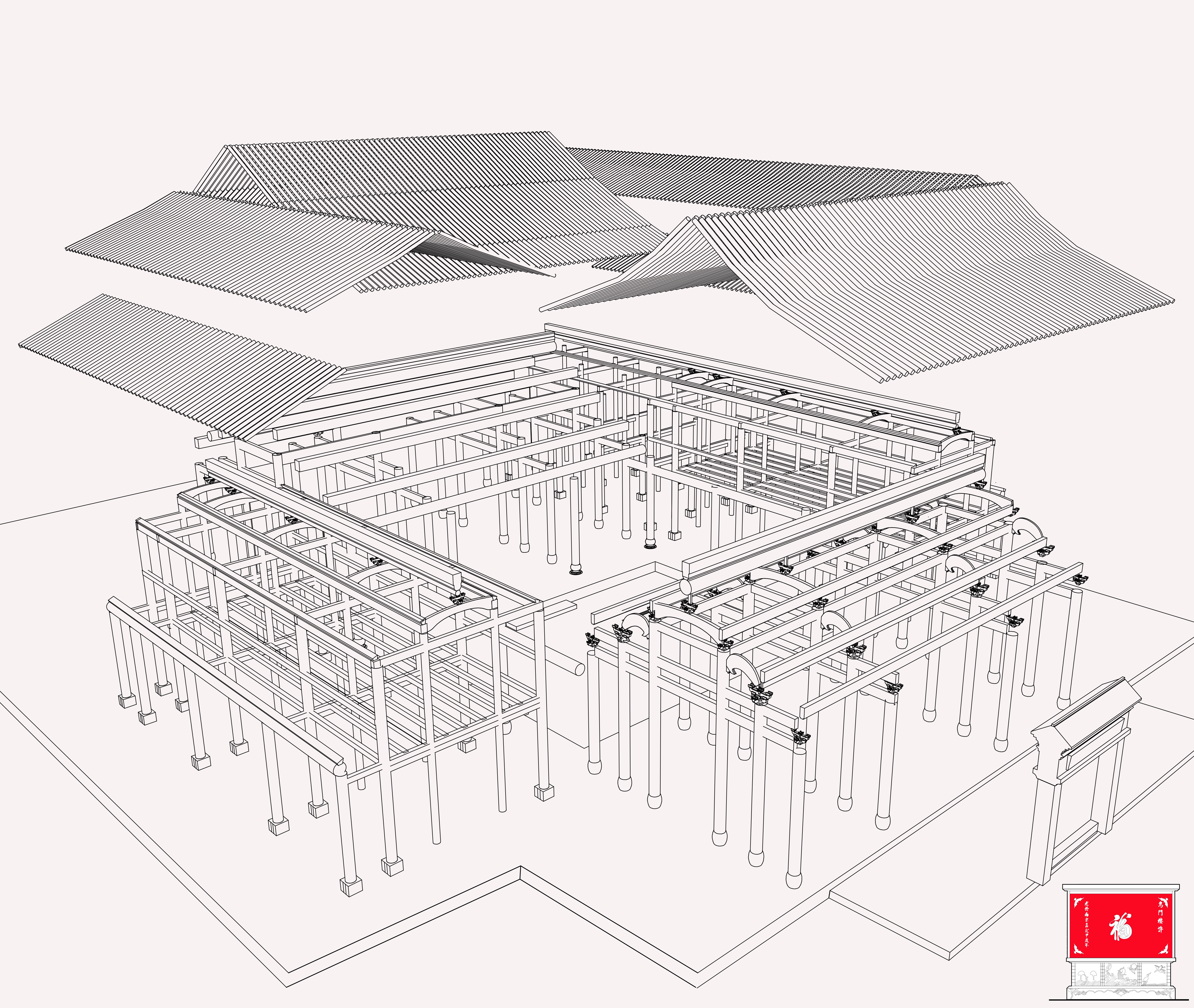 主体建筑有很多细部,门窗、梁柱和斗拱都非常有特点,如下图。
