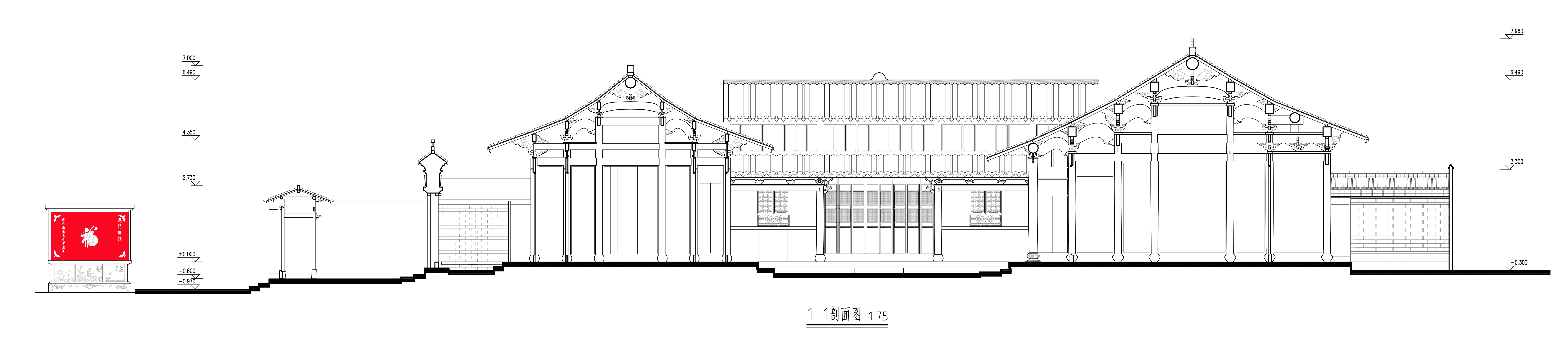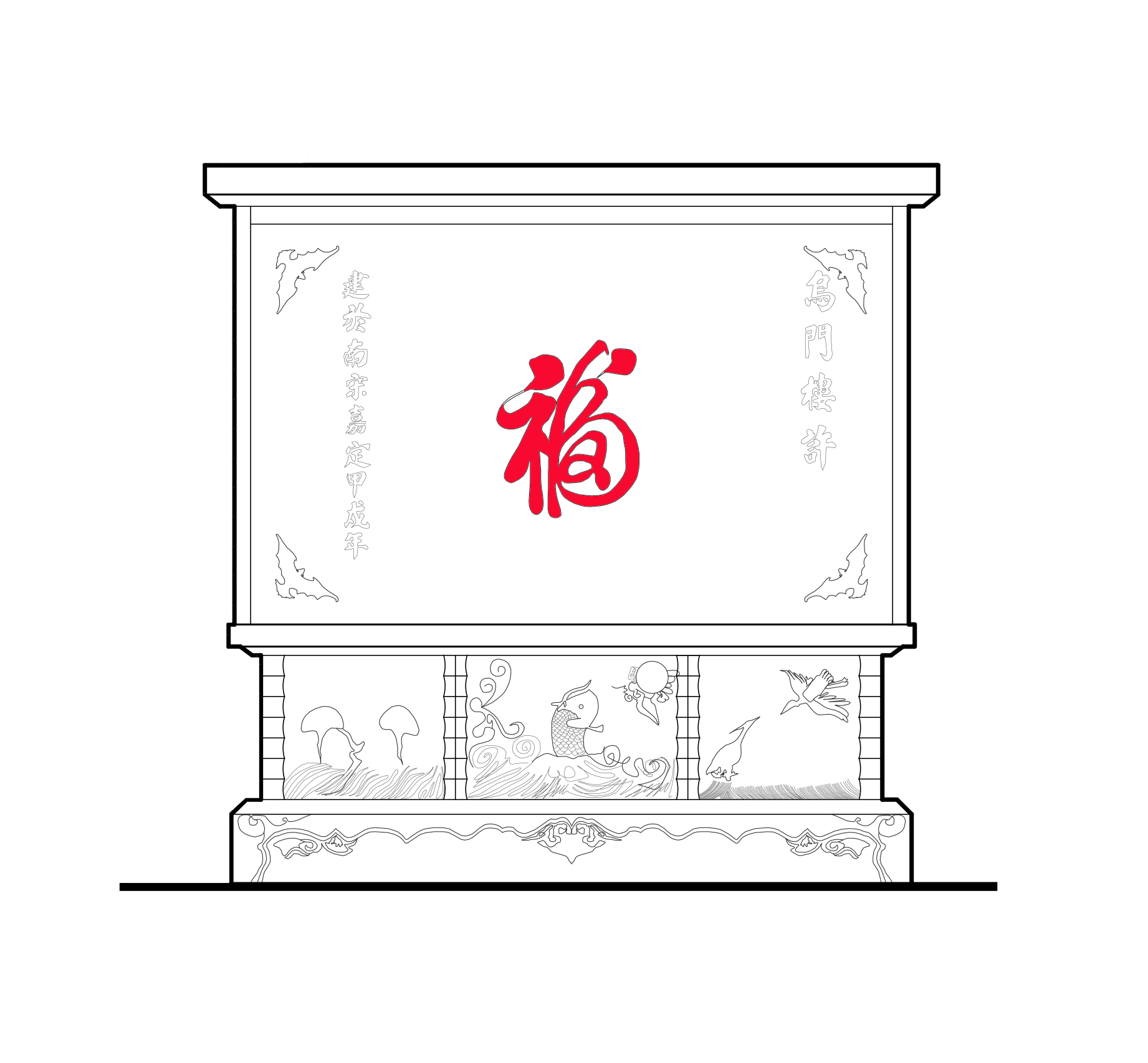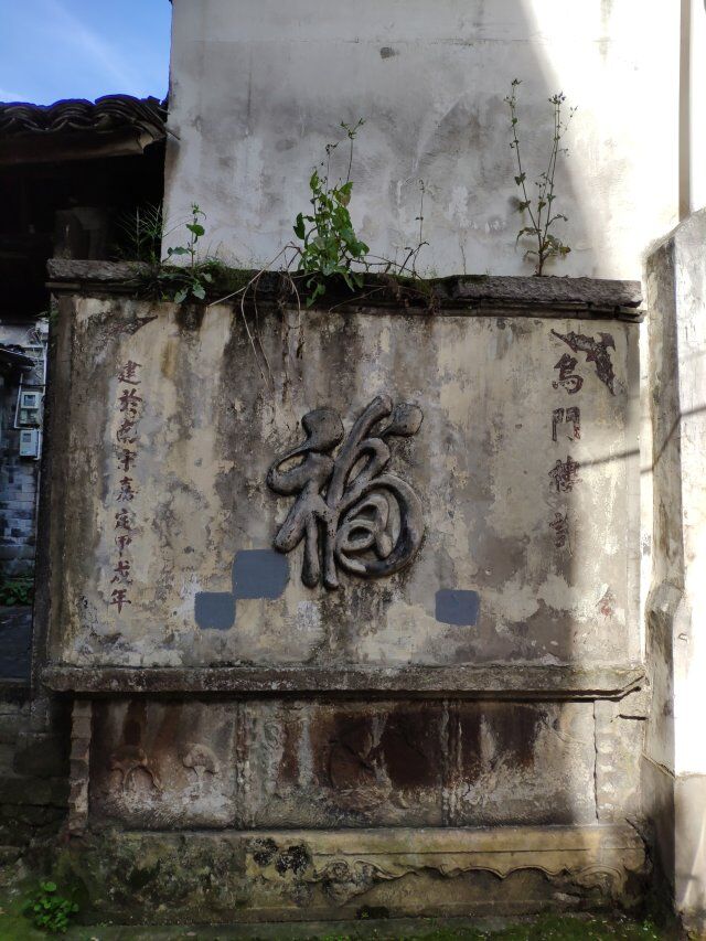 正对入口小巷的是一个古色古香的照壁,照壁上有“福”字及建楼年份,四角饰蝙蝠花纹。基部石刻浮雕三幅,为飞鹤及鲤鱼跃波图。