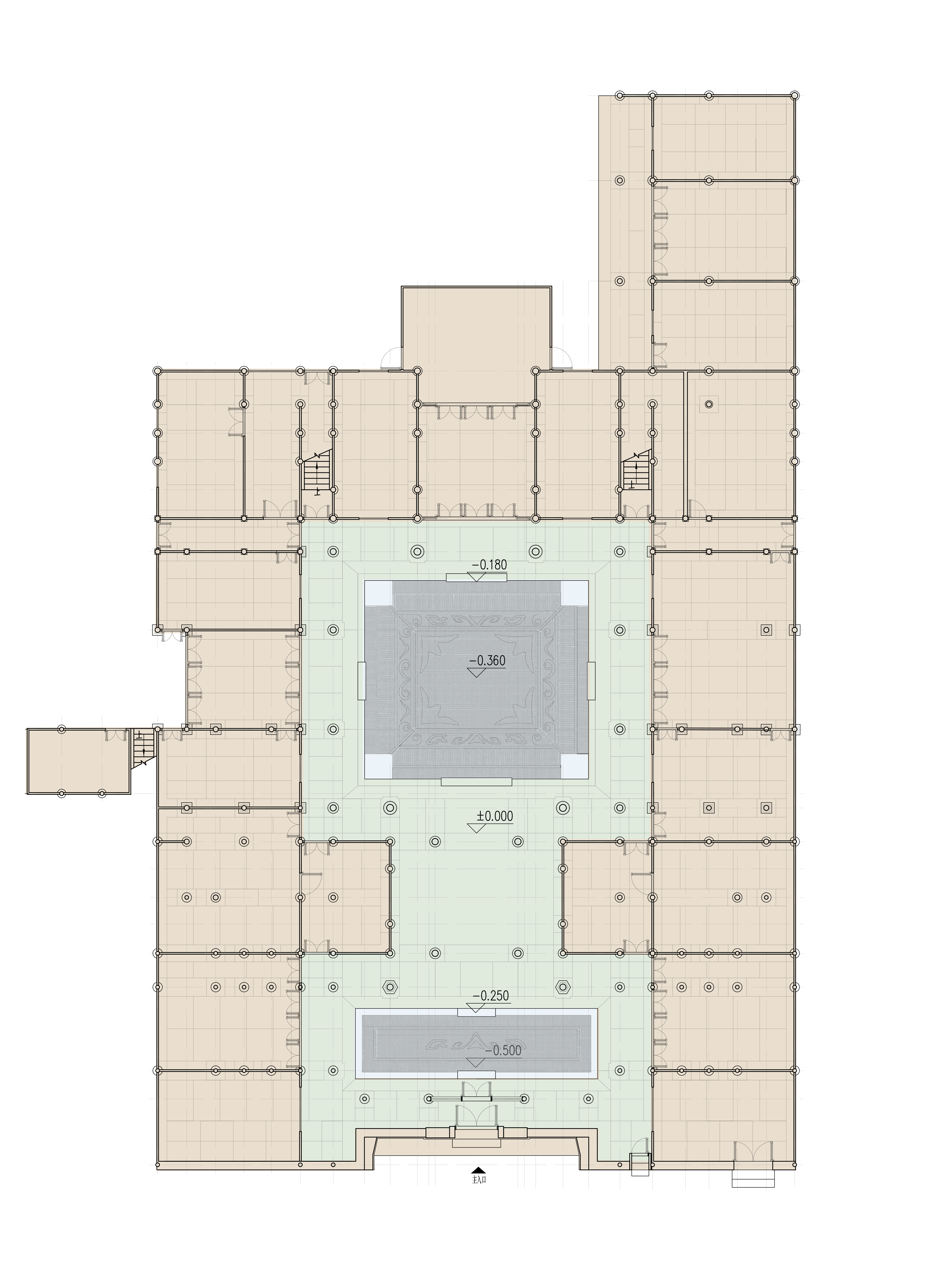 前院外围是一圈檐廊,东西有两座倒座房,穿过过厅是一个二层的四合院,近百平米铺地由黑白色鹅卵石构成蝙蝠等复杂花纹,寓意祝福。