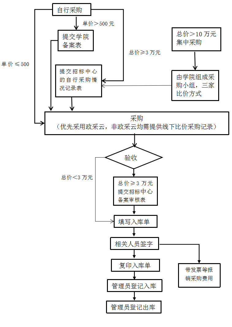 2. 自行采购易耗品时,自购耗材中单价>500元,需额外填报备案表提交学院审核备案。采购的易耗品,经仓库管理员核实入库单后,经分管领导签字后到计划财务处报销。