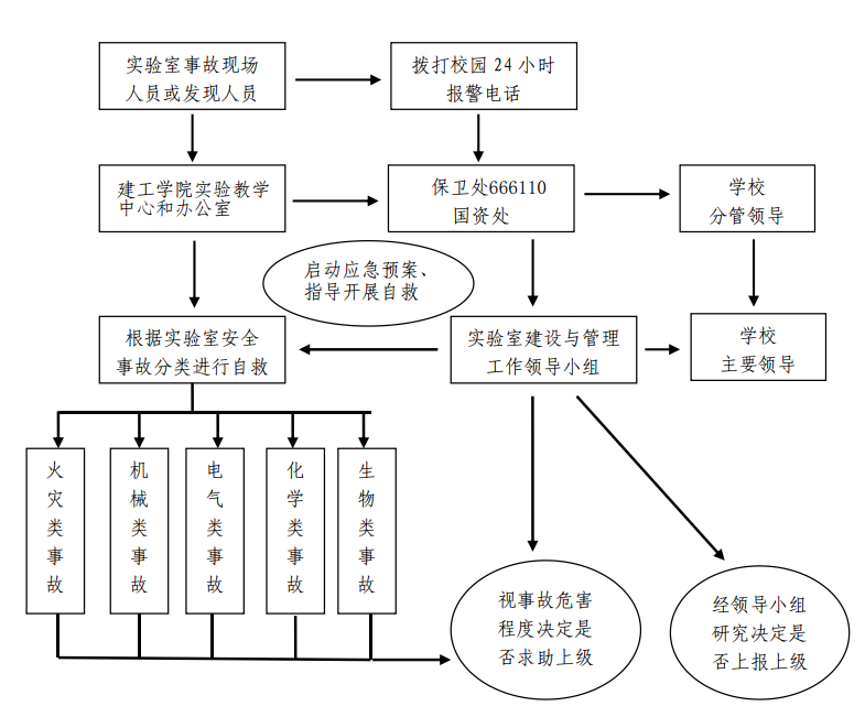 3. 学院负责人在积极组织现场应急处置工作的同时,立即报告保卫处与国资处。由保卫处与国资处立即向分管校领导汇报。实验室安全事故上报机制为:报告人→学院(部门)责任人→国资处和保卫处责任人→分管校领导(见附录)。