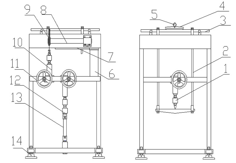 12.拉伸附件; 13.拉伸试件; 14.可调节底盘